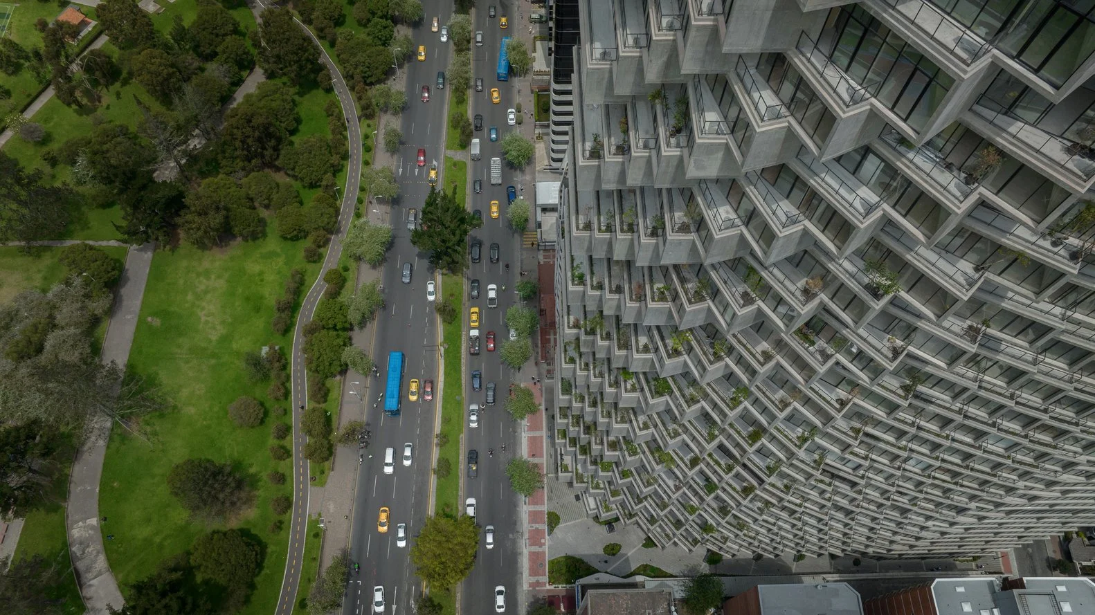 IQON is designed as a vertical community, and an extension of the neighboring La Carolina Park, which continues up onto the building facade. The building features a notable curved corner, wrapped by terraces that continue around the building's perimeter with views of the park, city and over the Pichincha volcano.