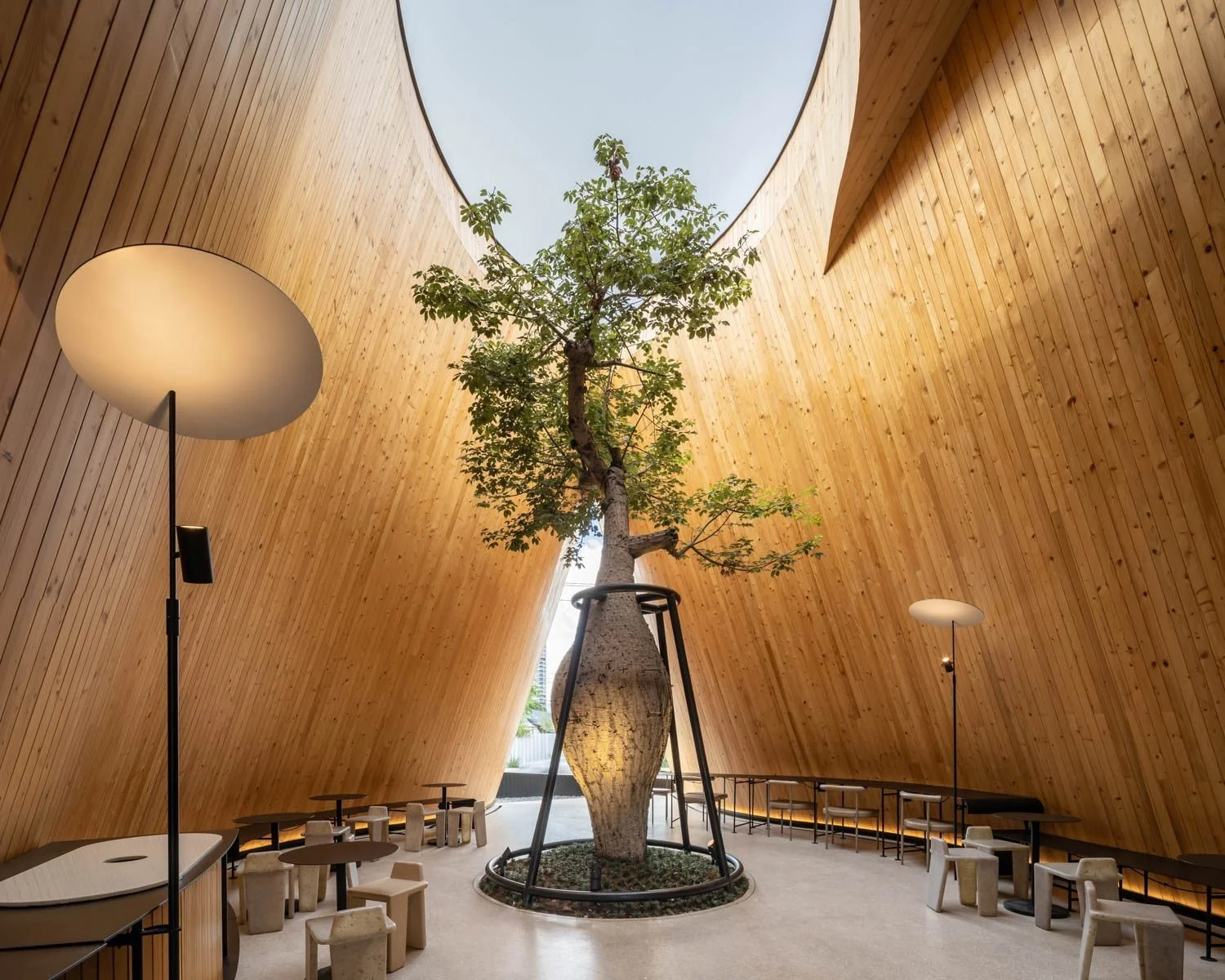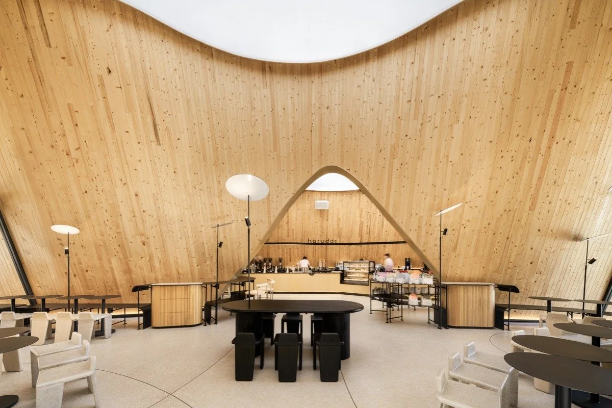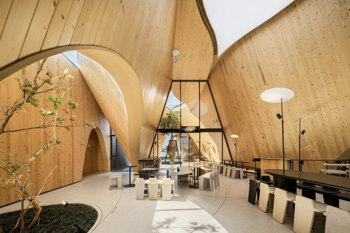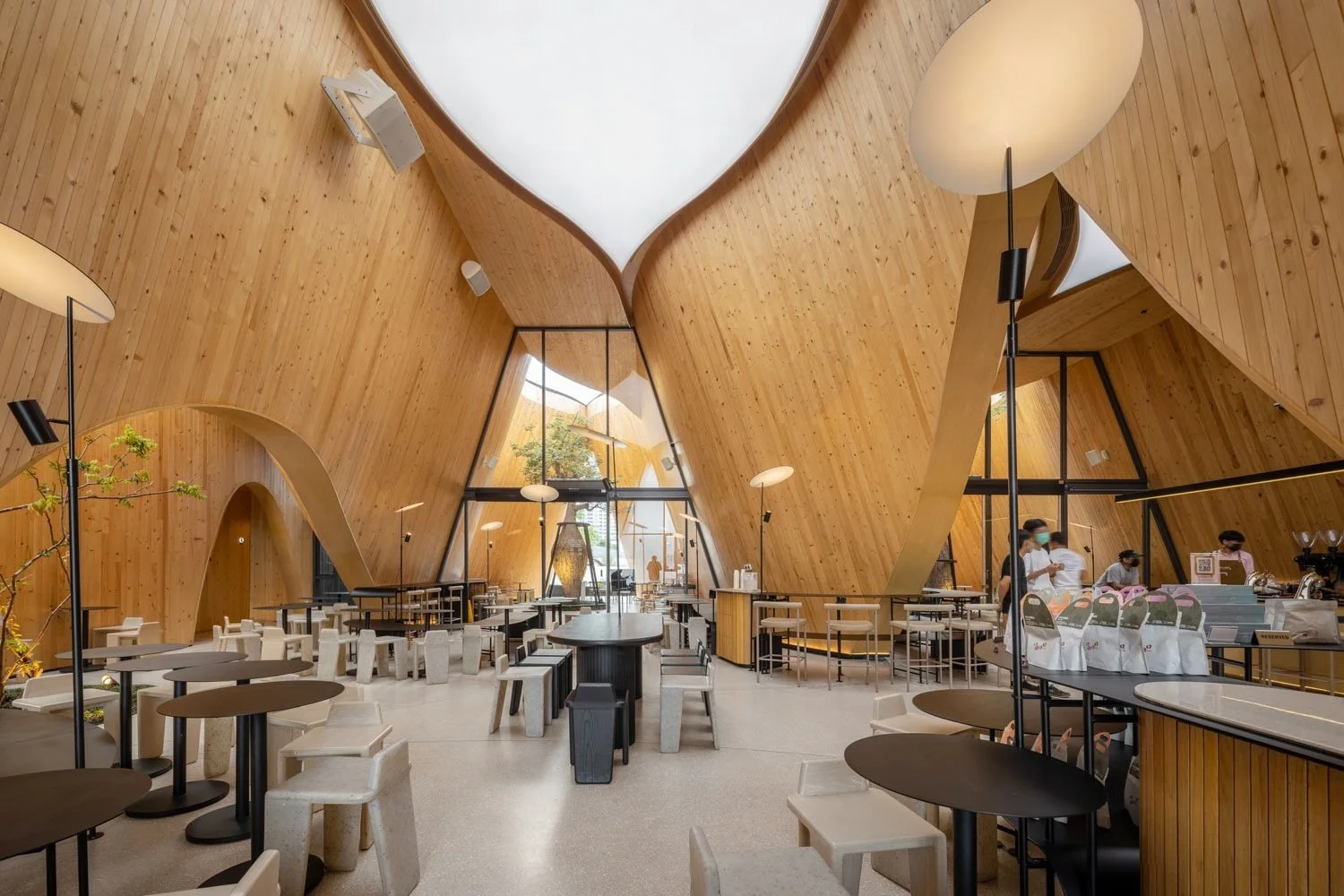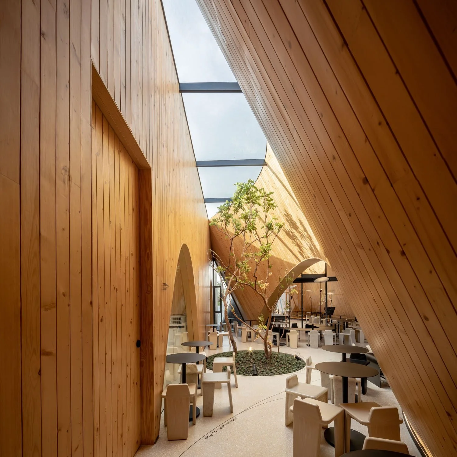IDIN Architects started the design process by working out how to include green spaces into the building’s form and concept. The contours of the green spaces beneath correlate to the three connected gable roof structures. The skylight defines the boundaries of indoor and outdoor functional spaces. Visitors entering the café from the front will notice the skylight, whose openness defines the semi-outdoor space of the café and leads visitors further into the interior. Inside, another skylight is covered with tarps, protecting the space from rain while allowing natural light to enter.
