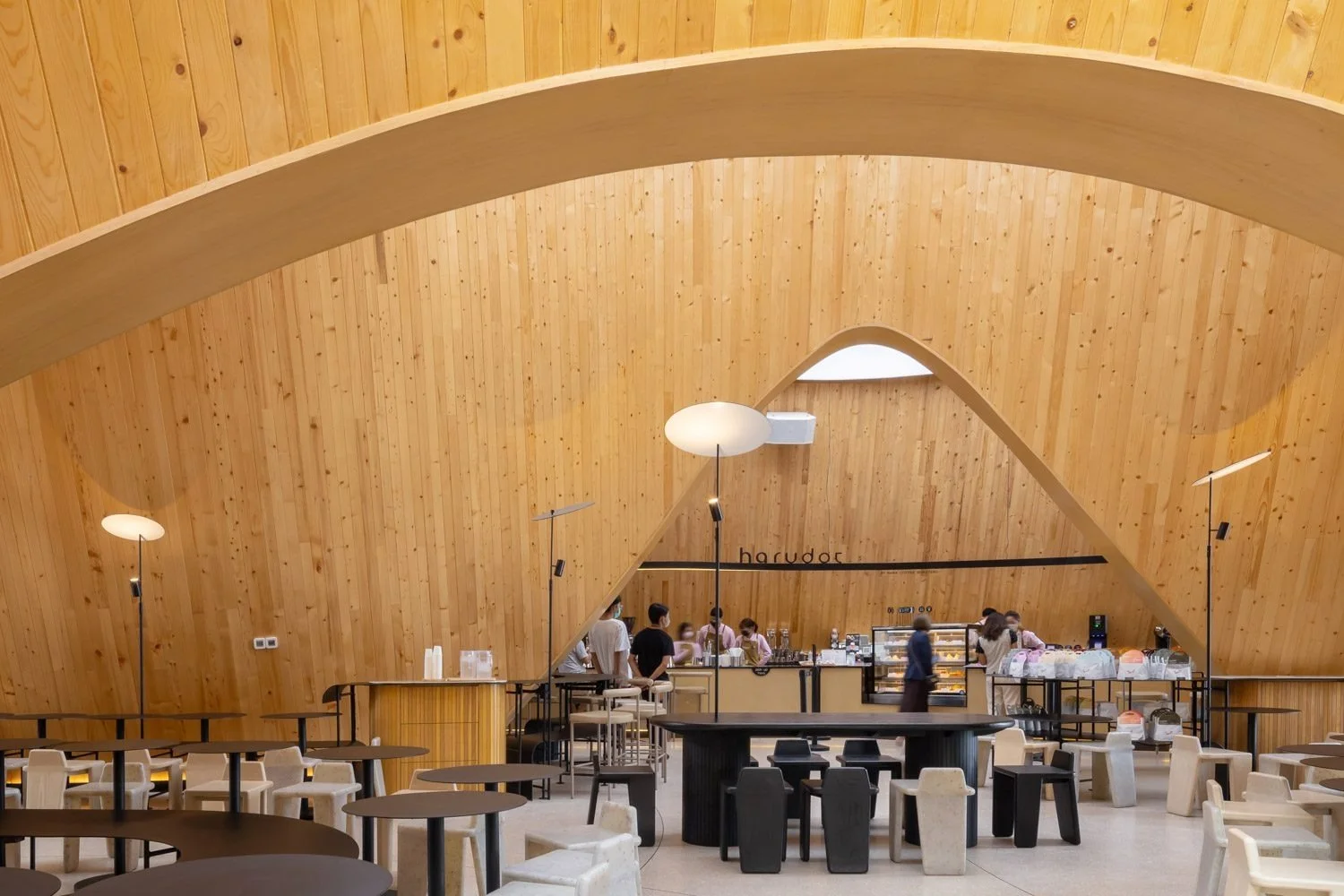 With Harudot positioning itself as a travel destination, creating spaces that can be photographed on social media is one of the factors that the design team prioritizes. These spaces have been created to be visually appealing and suitable for taking pictures and sharing them on social media. The use of black wood for the exterior and natural pine wood for the interior brings a distinctive character to the place, resulting in the photographs taken at the café being easily identified and recognized. The design of the uplight lamps, which reflect the metal plates on the ceiling, creates a soft illumination that beautifully lights up the space. The success of the design is evident from the number of people with cameras waiting in a long line to be photographed with the café’s famous spots and corners.